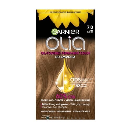 Garnier Olia hair dye shade 7.0, “Dark Blonde,” is a pure, dark blonde shade without other reflects—allowing your natural tones to show through while also providing 100% gray coverage.