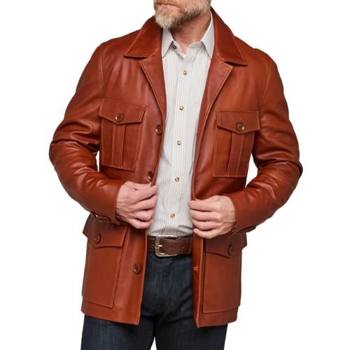Introducing the Lucas Brown Leather Safari Jacket for Men, crafted from premium 100% lambskin leather. This rugged yet sophisticated brown safari jacket features a classic buttoned closure and a stylish notch lapel collar. The viscous inner lining ensures comfort and durability, perfect for all-day wear. With four outer buttoned pockets and two inside pockets, it offers ample storage for your essentials. Designed for the adventurous man, this jacket blends functionality with timeless style. Elevate your outdoor wardrobe with this versatile and elegant leather safari jacket.